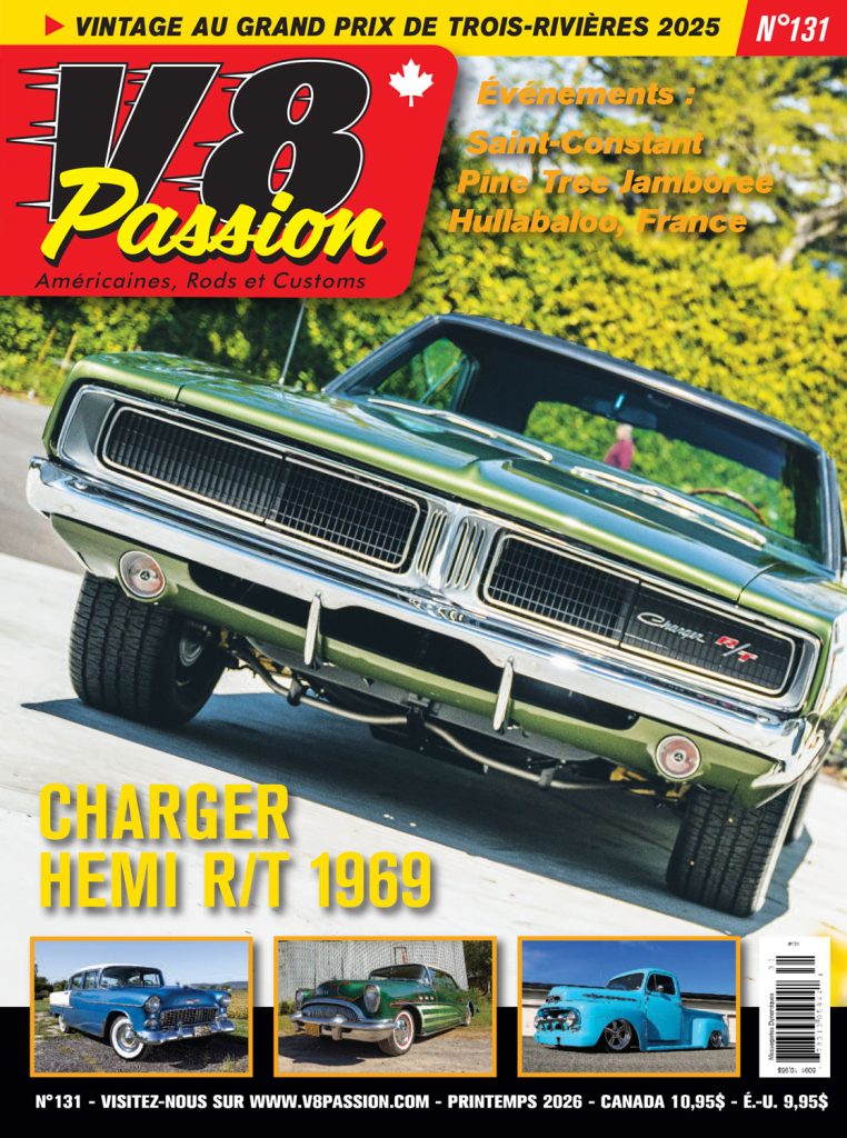 Sur la couverture et sur six pages, vous trouverez une Charger R/T Hemi de 1969, suivie d’une Chevrolet Bel-Air de 1955, achetée neuve à Montréal. Un pickup Ford F1 de 1951 savamment modifié et une Buick Super 1954 custom, puis des comptes rendus. Près de Montréal avec l’expo de Saint-Constant, puis à Trois-Rivières pour le Grand Prix qui accueille des courses de vintage, encore plus vintage, le Pine Tree Jamboree dans le Maine et ses courses de hot rods à moteurs flathead et on traverse enfin l’océan pour visiter une exposition au Luxembourg ! Est-ce assez varié à votre goût ?